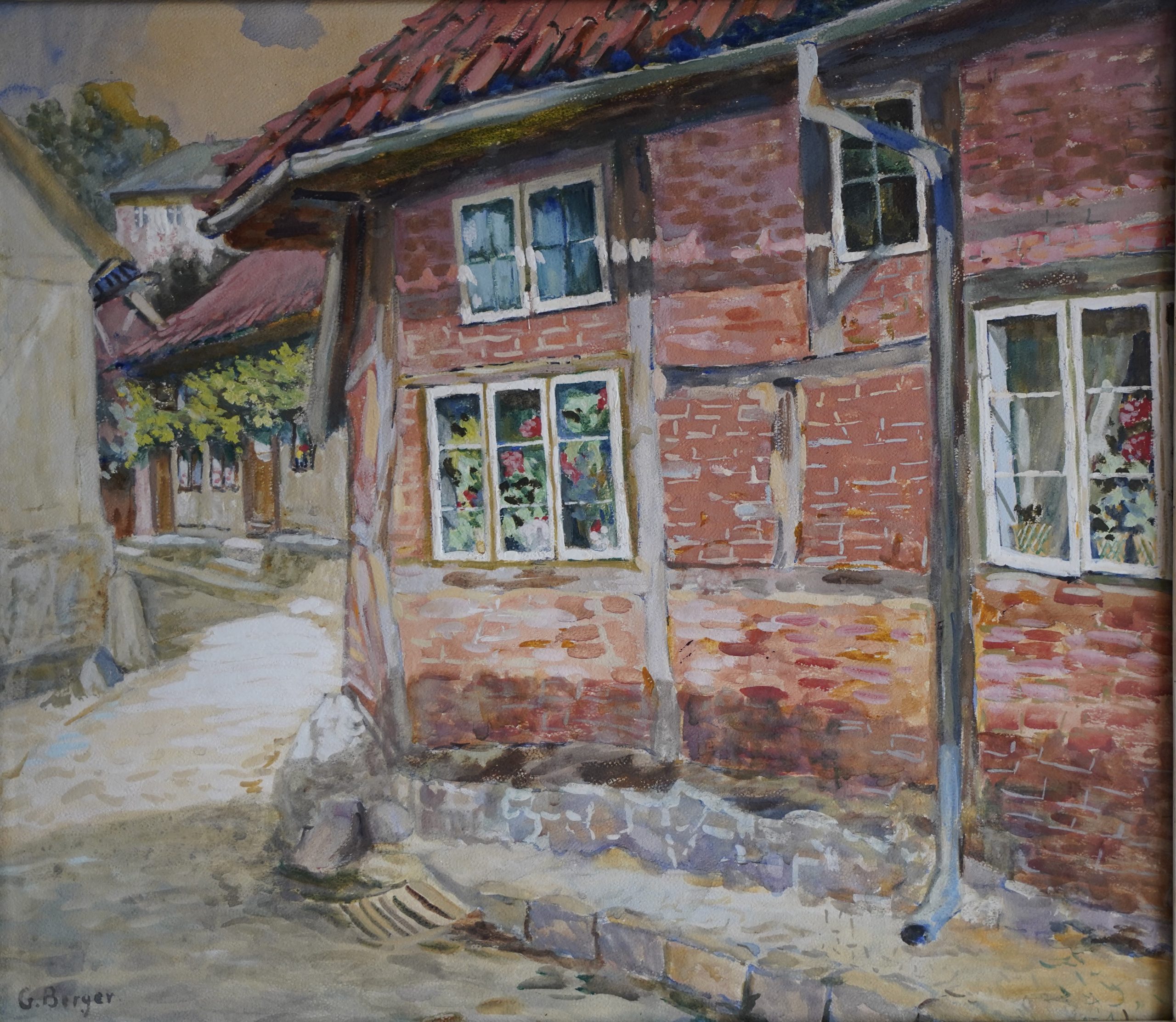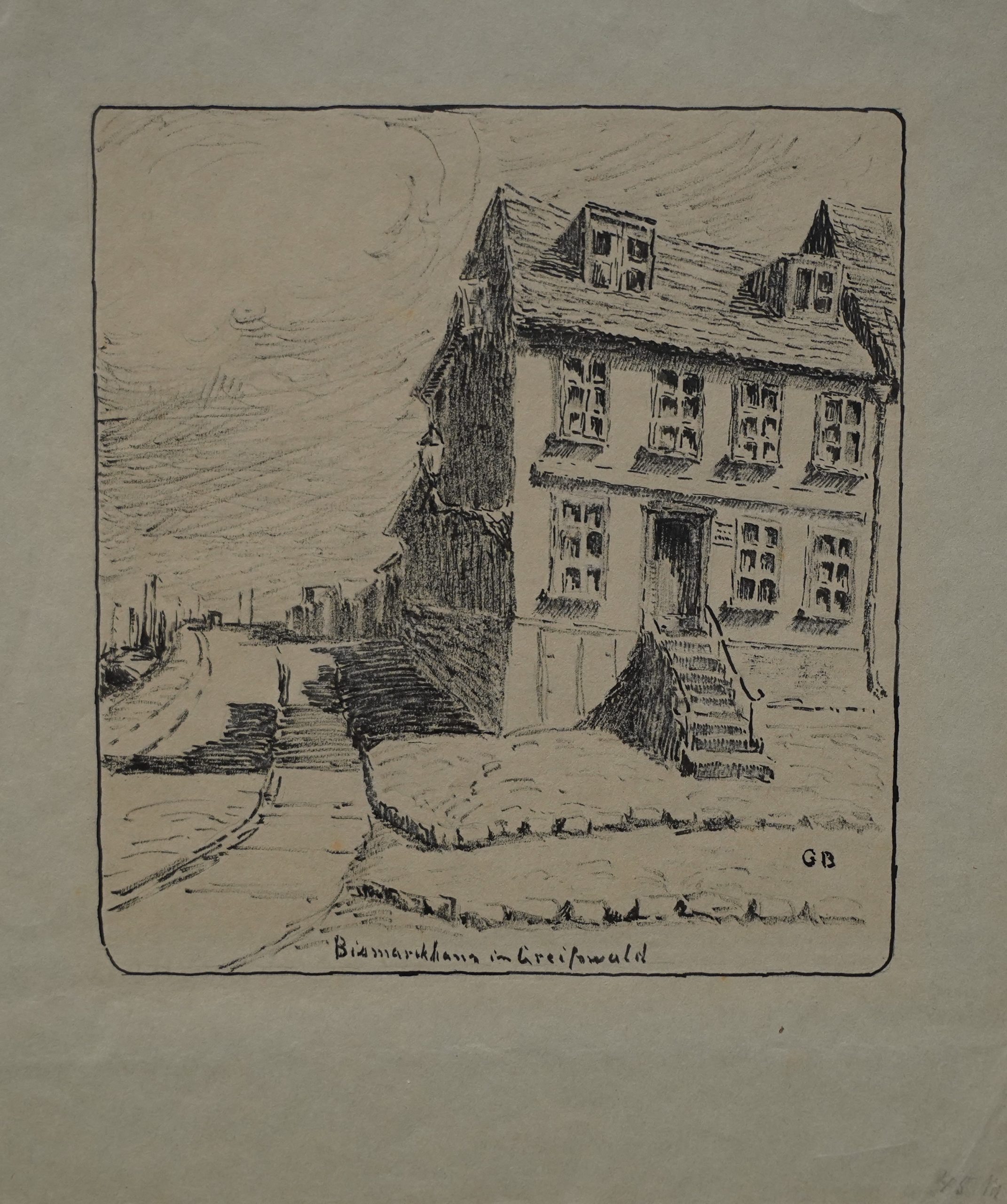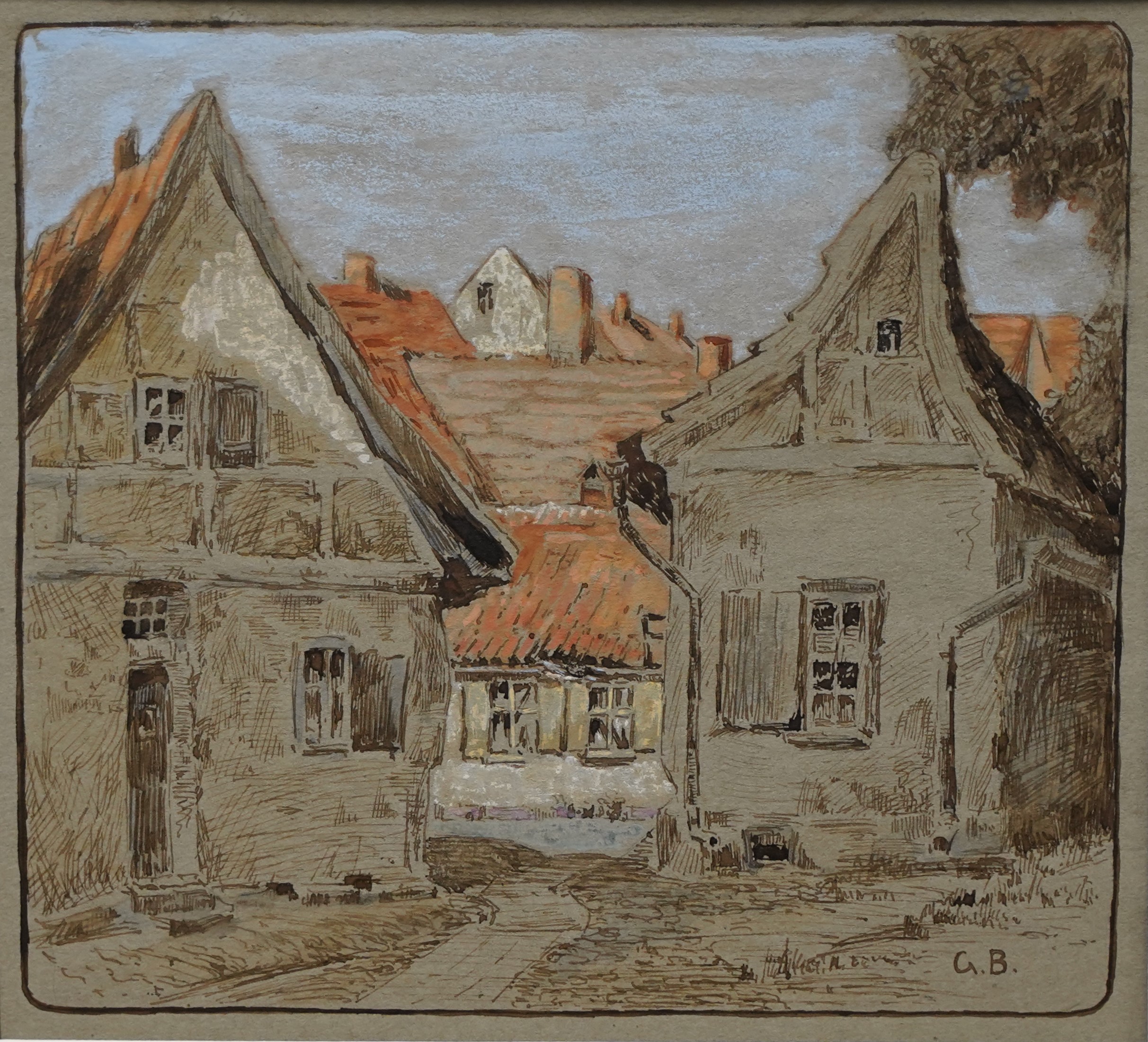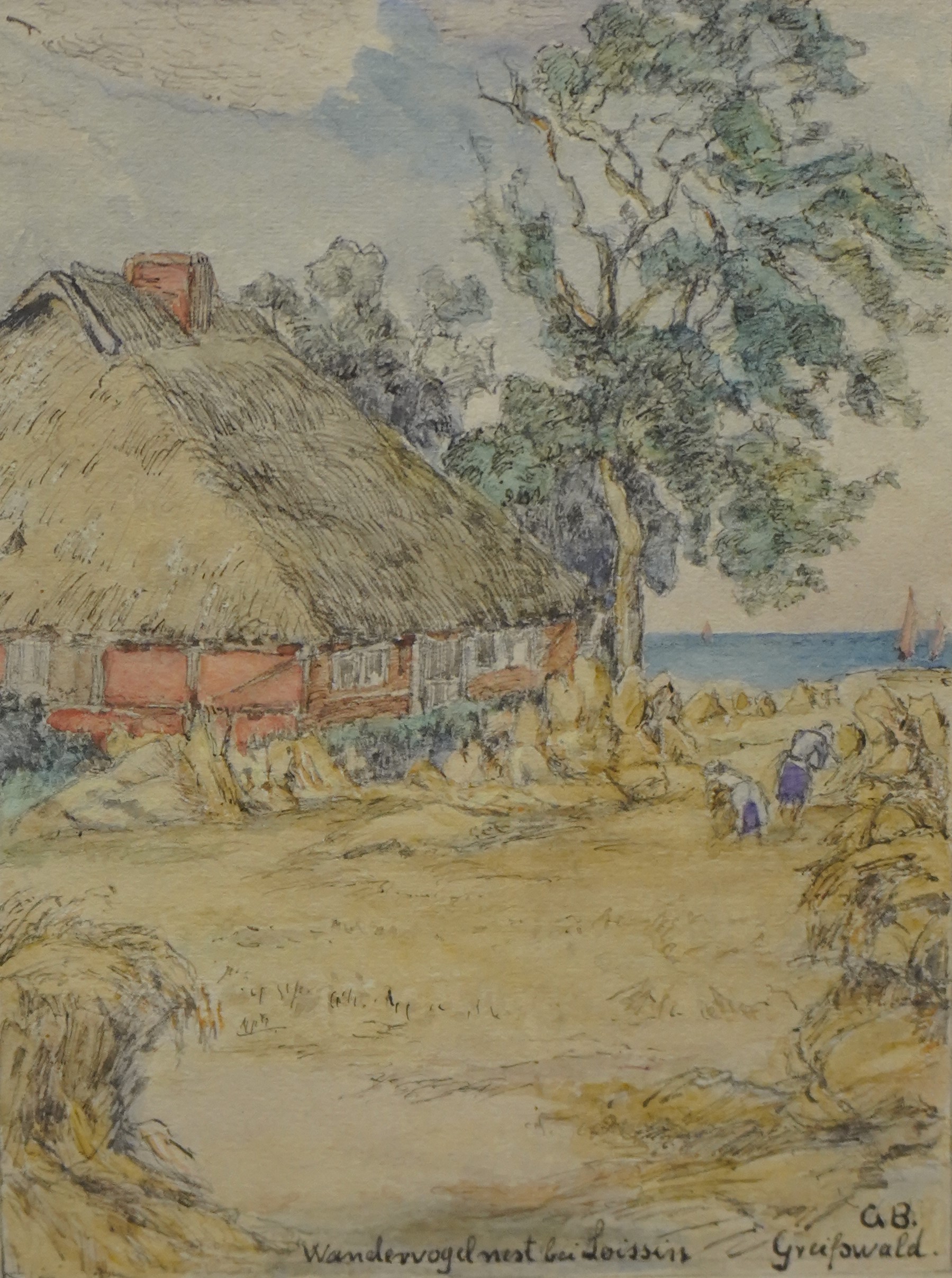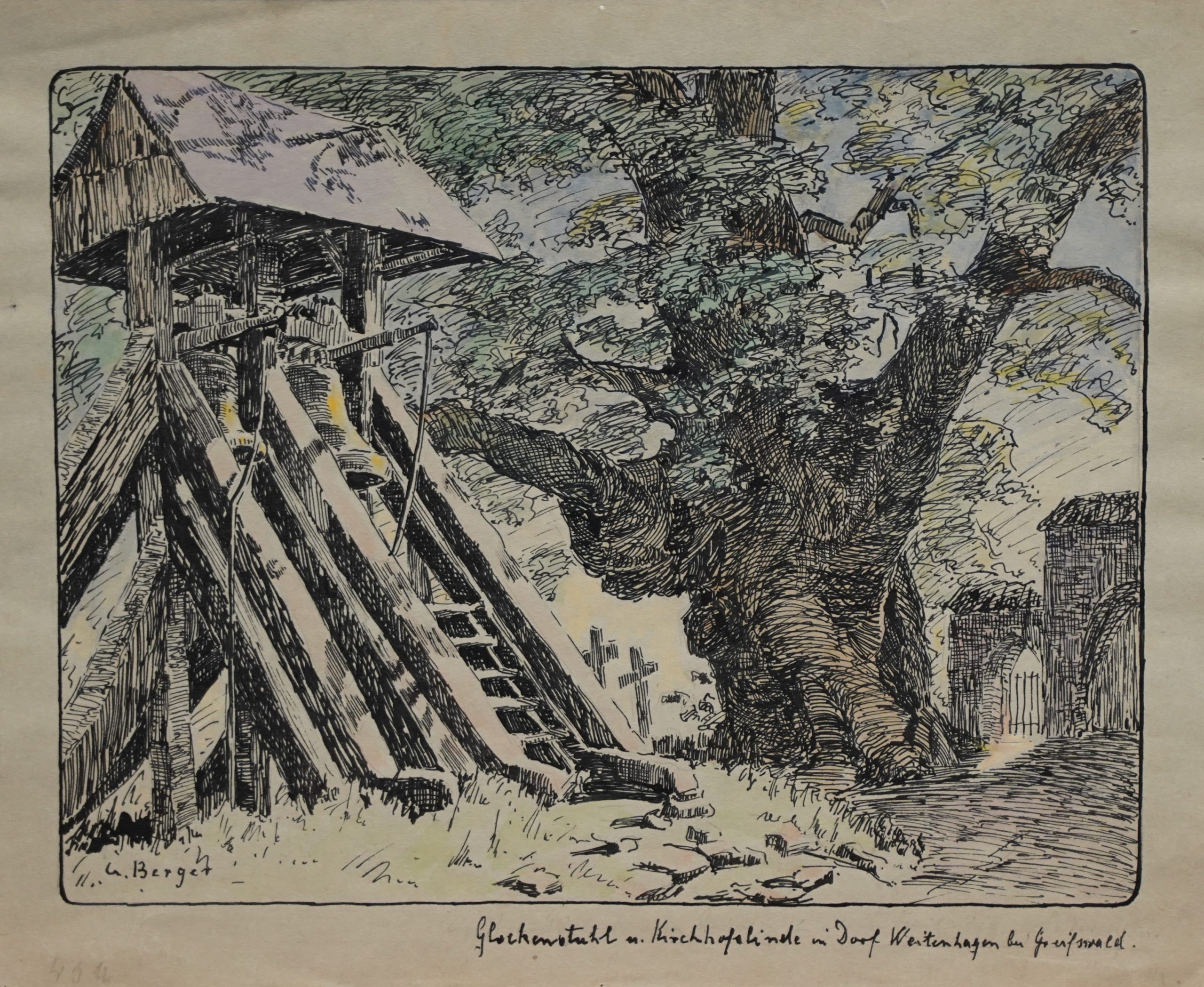 Papier / Bleistift koloriert. Glockenstuhl und Linde in Weitenhagen; kolorierte Federzeichnung; links im Vordergrund ein Glockenstuhl, rechts daneben eine alte knorrige Linde, dazwischen zwei Kreuze, im Hintergrund ist Friedhofstor sichtbar
