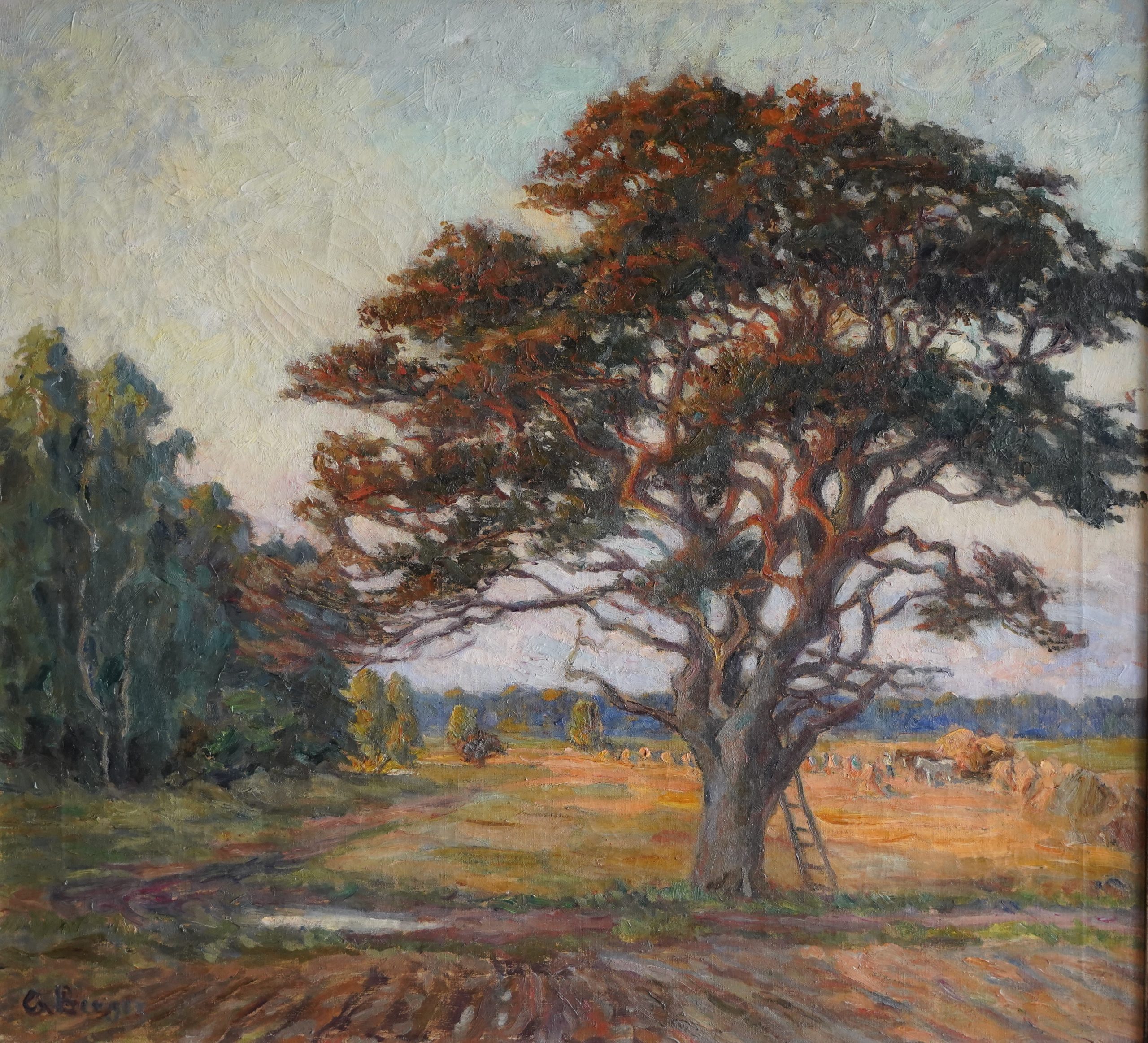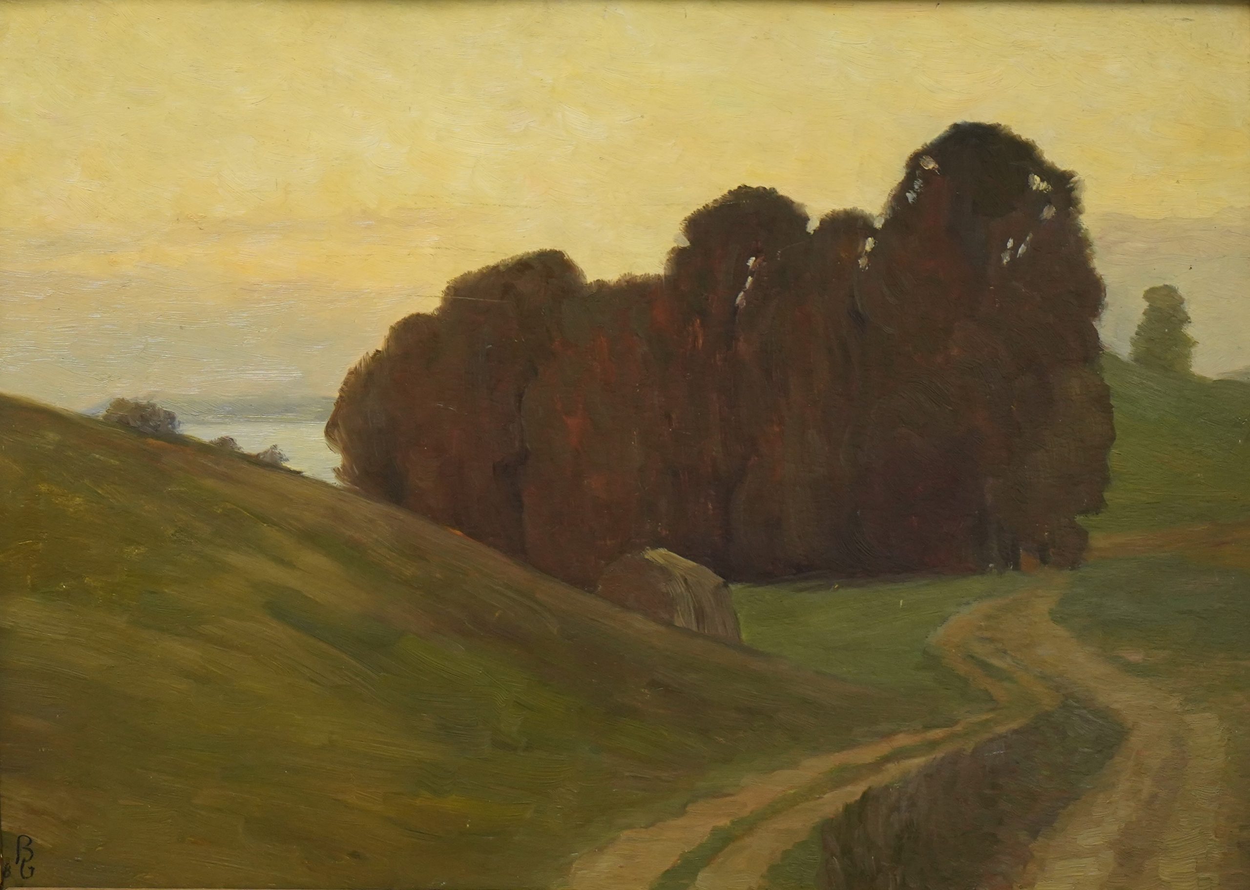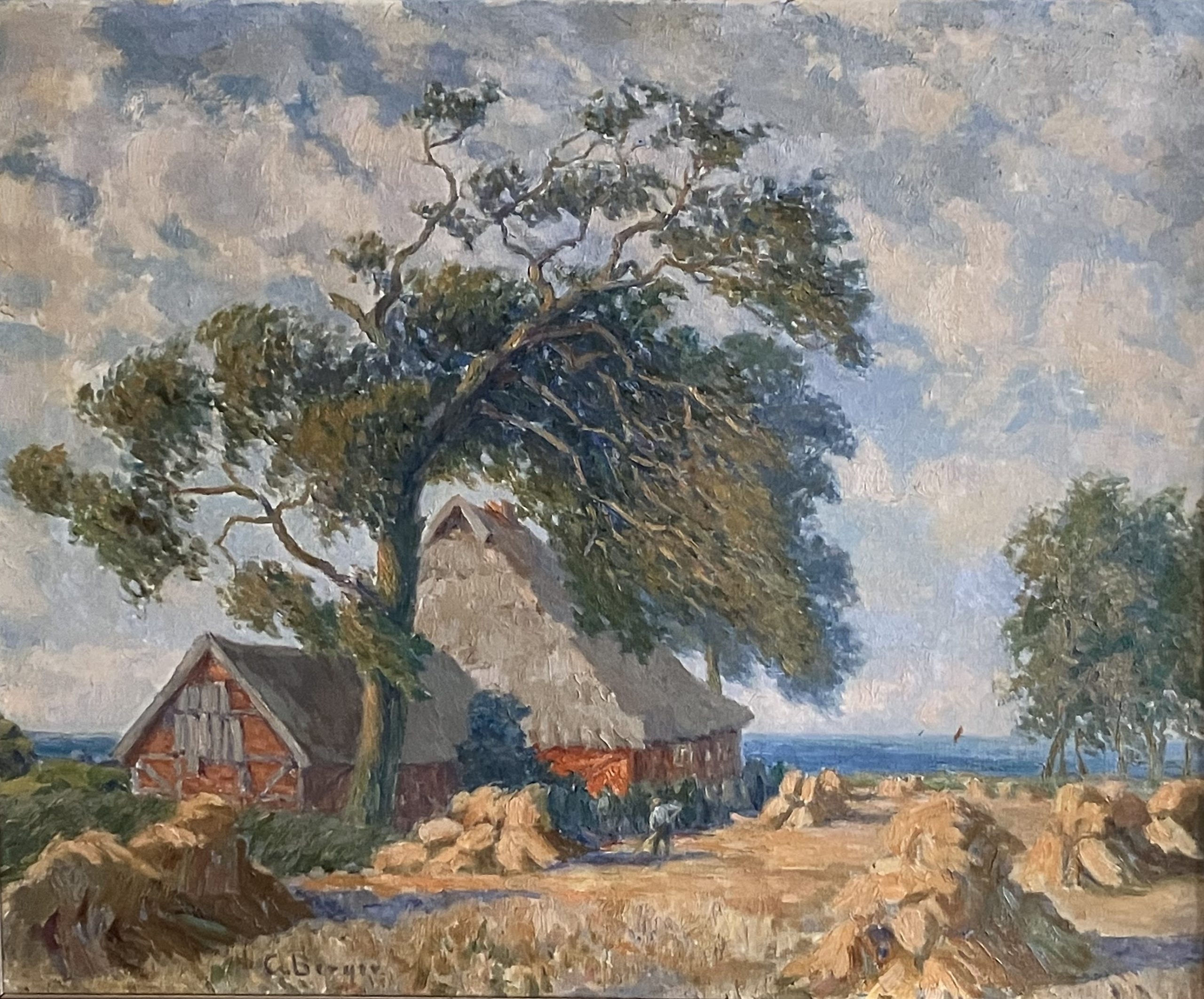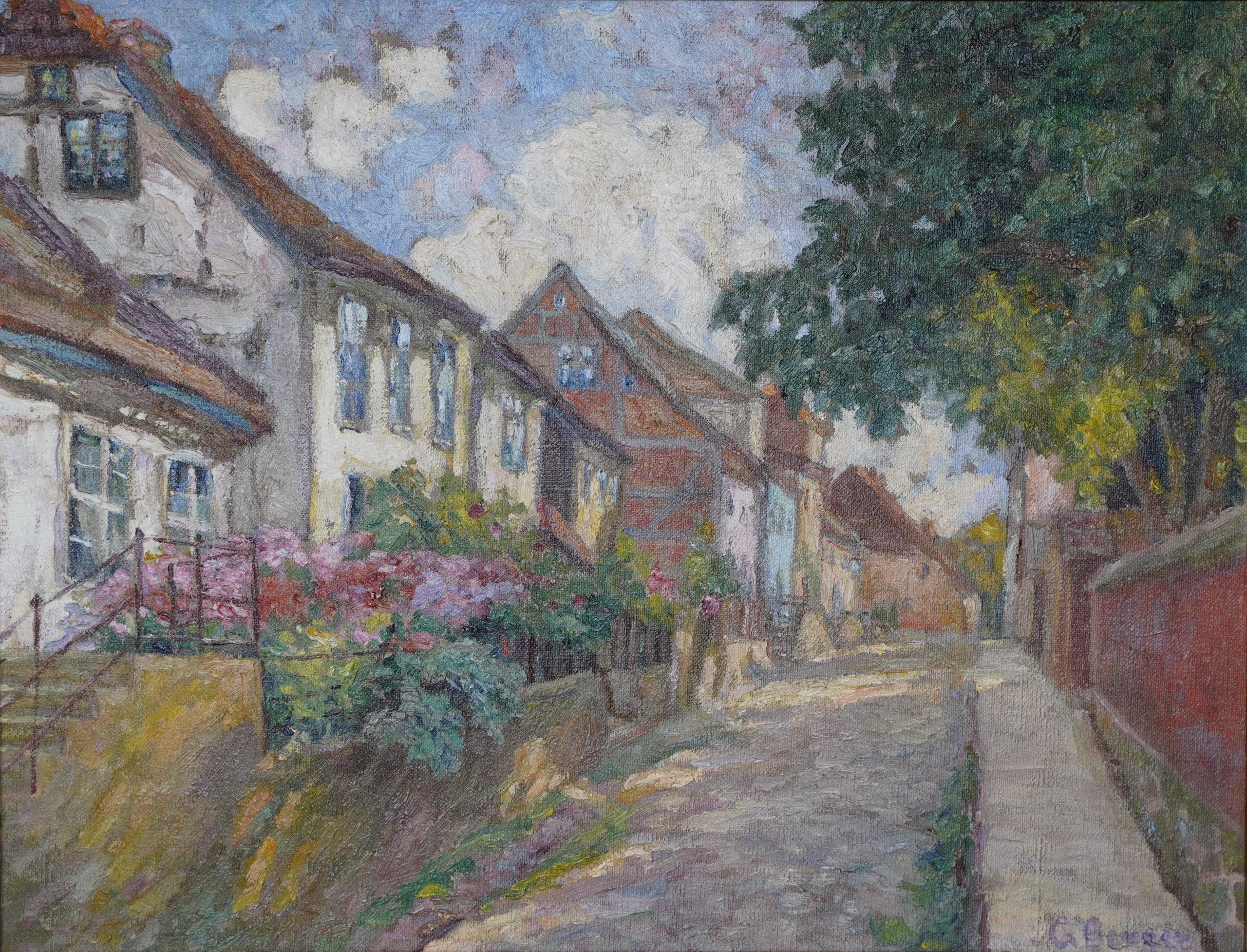 Papier / Bleistift koloriert. Glockenstuhl und Linde in Weitenhagen; kolorierte Federzeichnung; links im Vordergrund ein Glockenstuhl, rechts daneben eine alte knorrige Linde, dazwischen zwei Kreuze, im Hintergrund ist Friedhofstor sichtbar