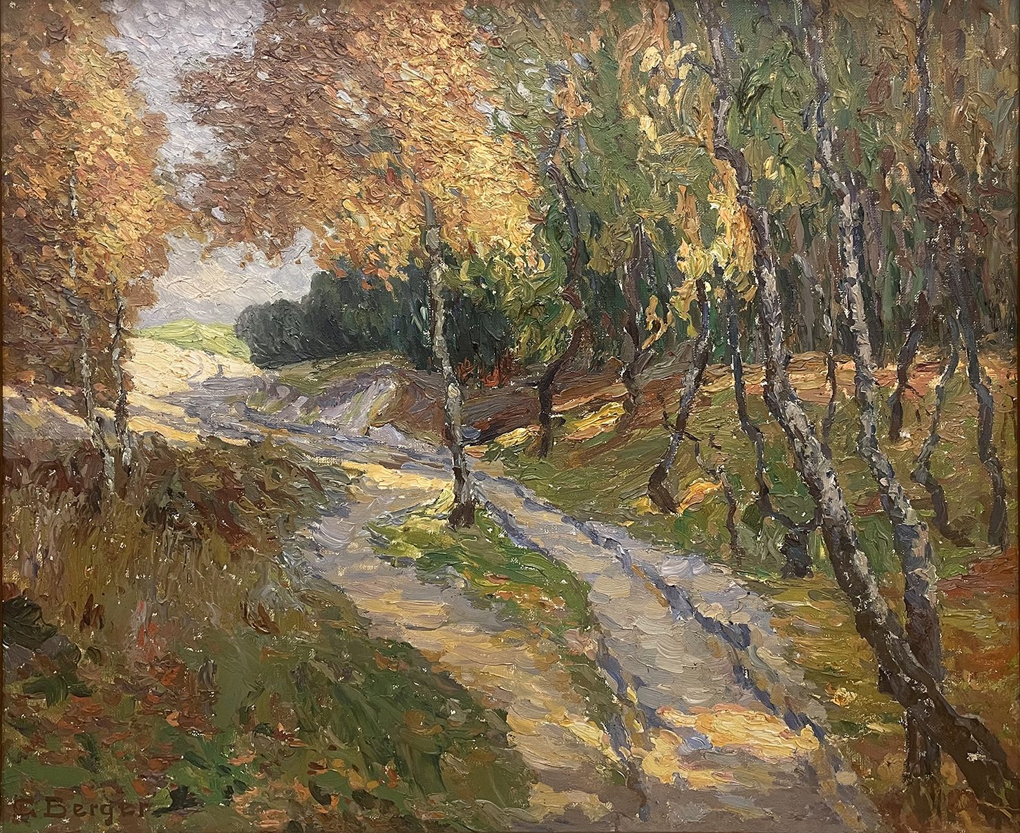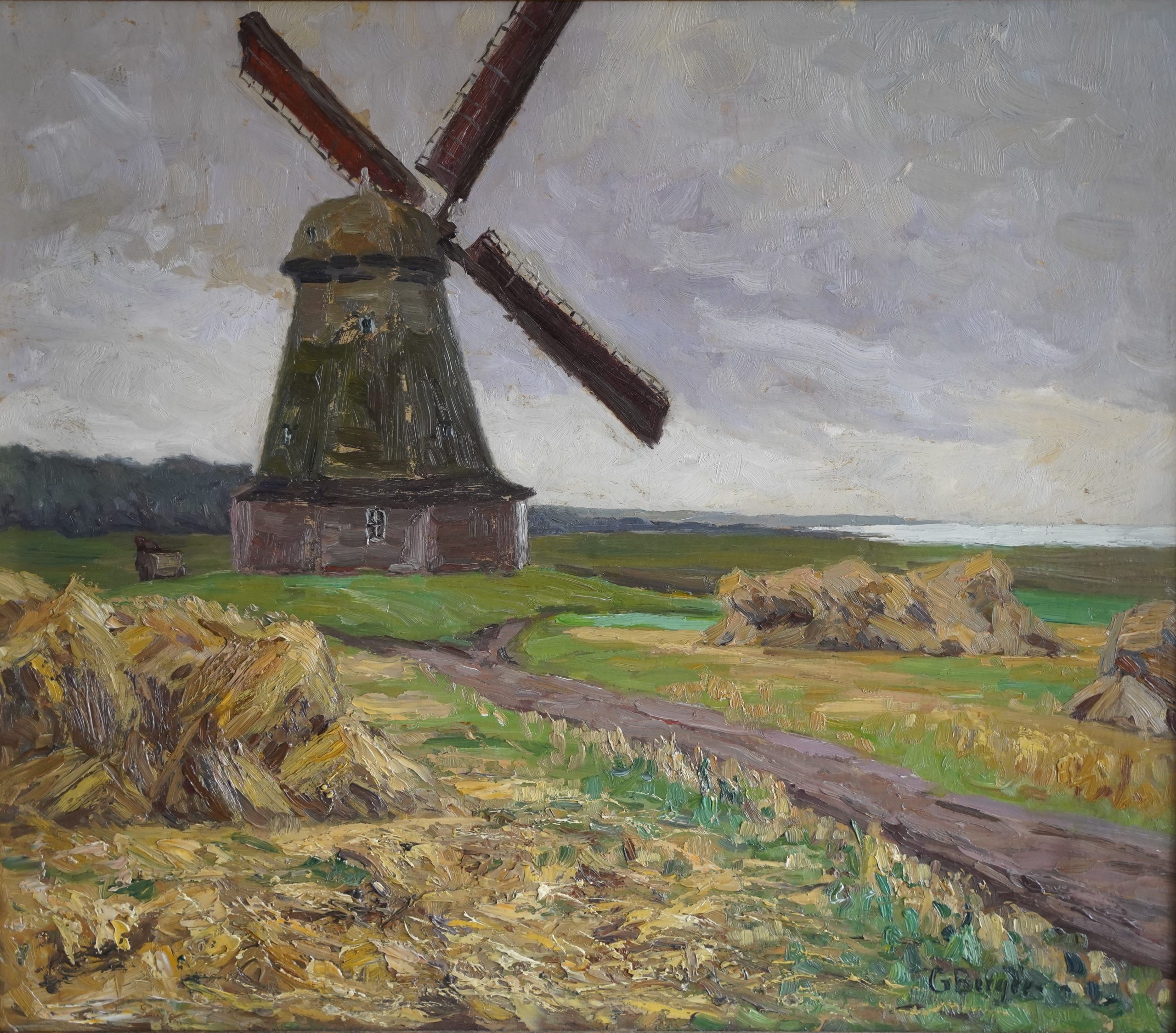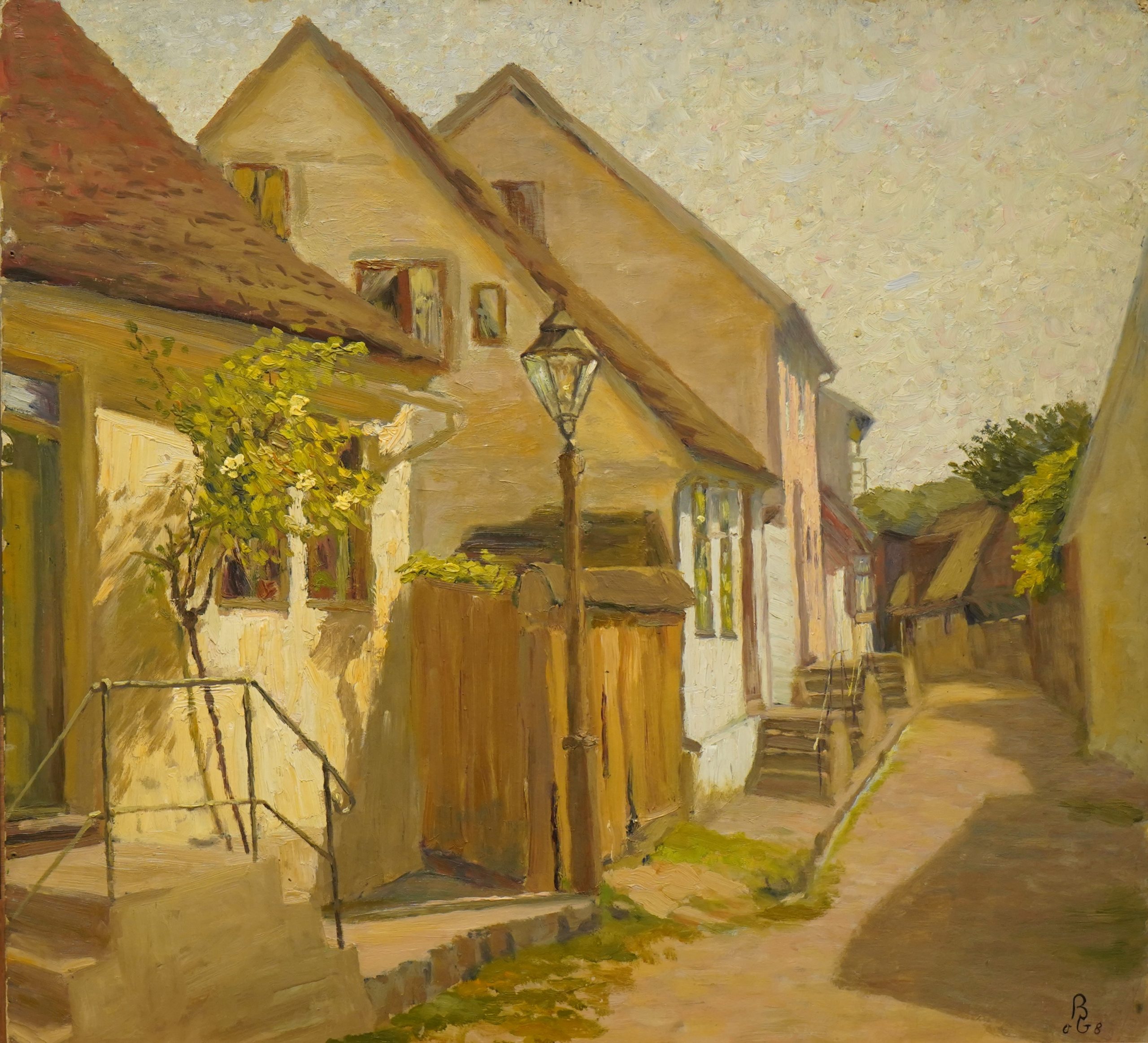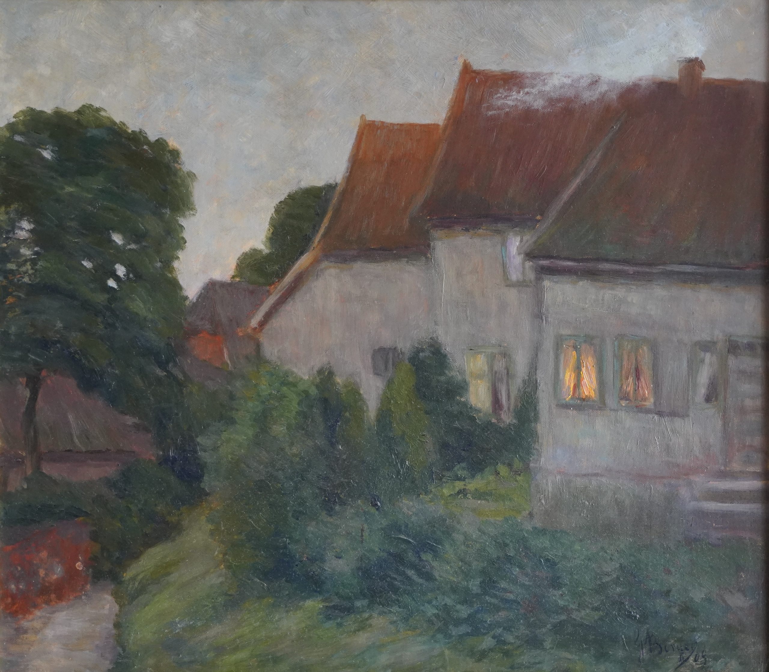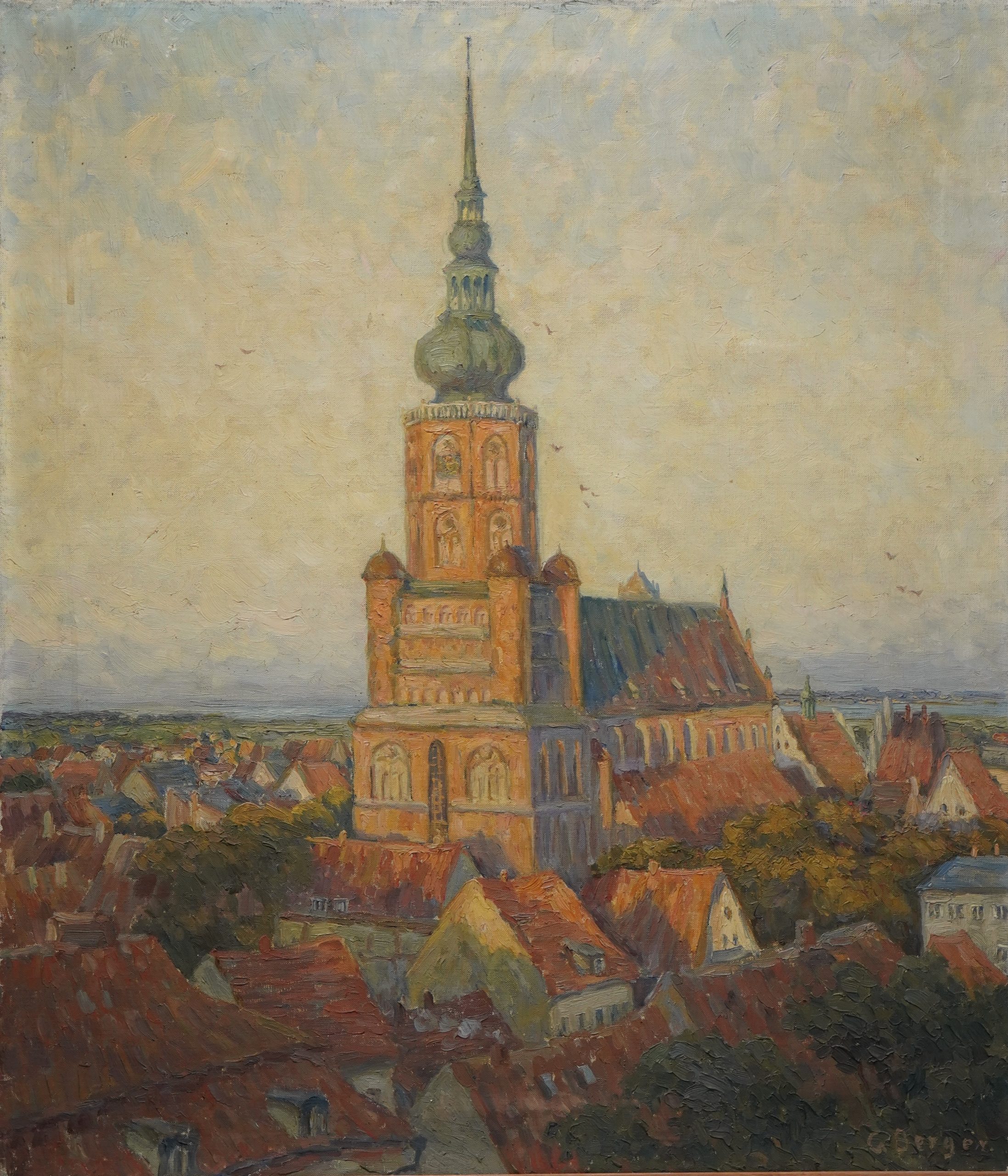 Papier / Bleistift koloriert. Glockenstuhl und Linde in Weitenhagen; kolorierte Federzeichnung; links im Vordergrund ein Glockenstuhl, rechts daneben eine alte knorrige Linde, dazwischen zwei Kreuze, im Hintergrund ist Friedhofstor sichtbar