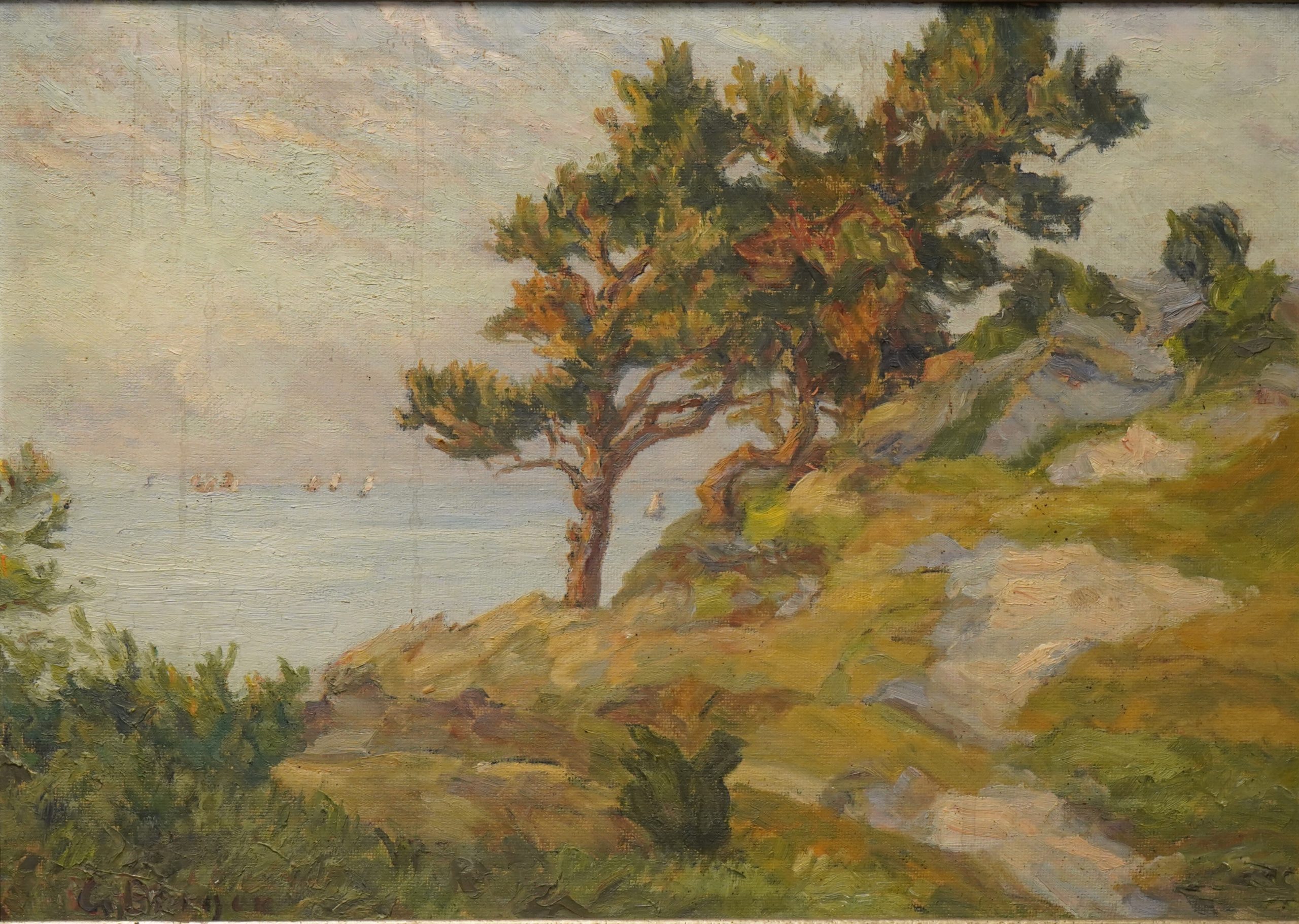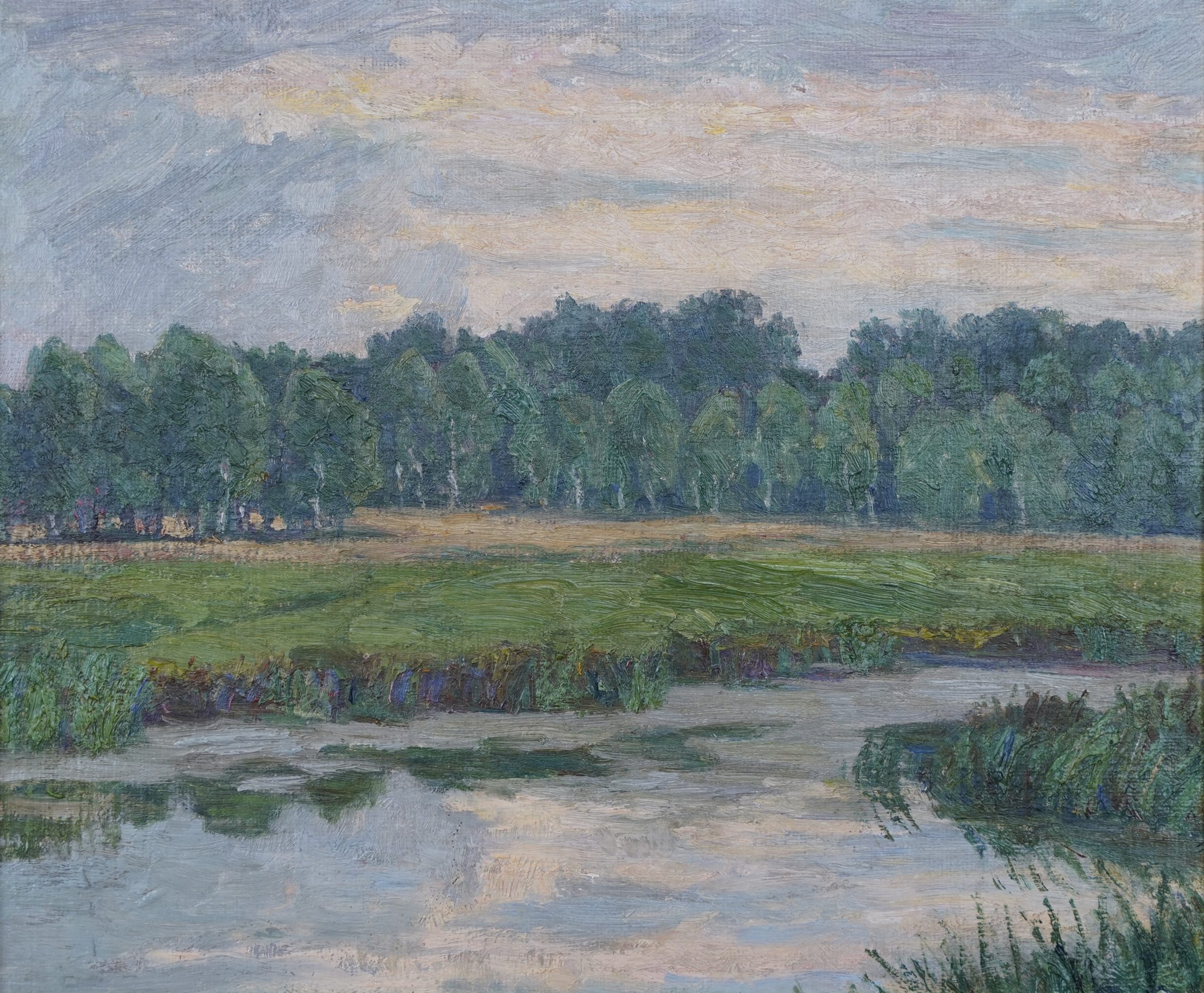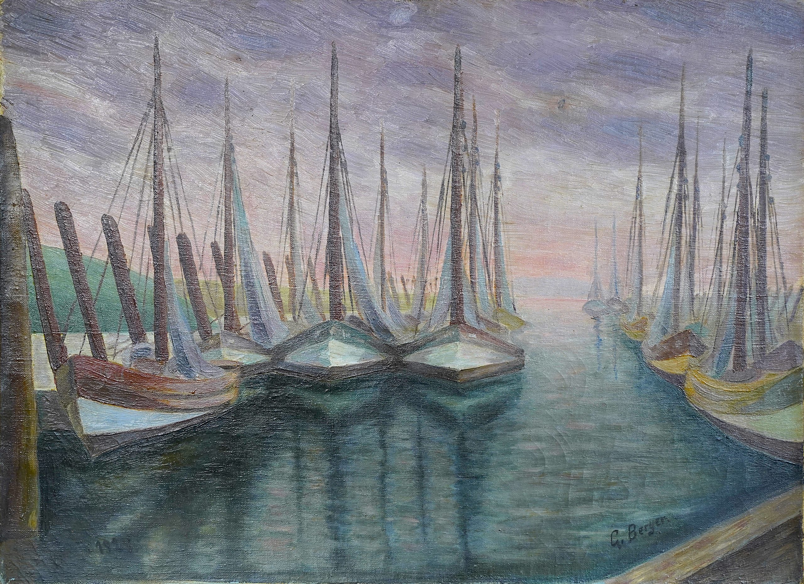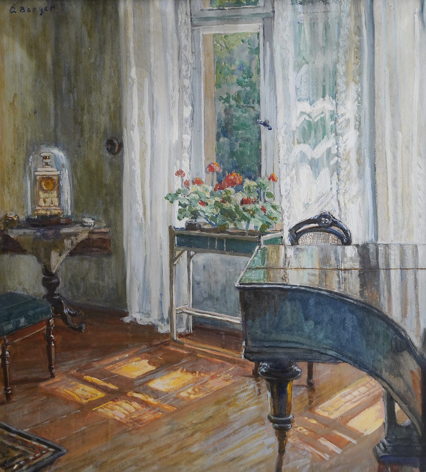 Papier / Bleistift koloriert. Glockenstuhl und Linde in Weitenhagen; kolorierte Federzeichnung; links im Vordergrund ein Glockenstuhl, rechts daneben eine alte knorrige Linde, dazwischen zwei Kreuze, im Hintergrund ist Friedhofstor sichtbar